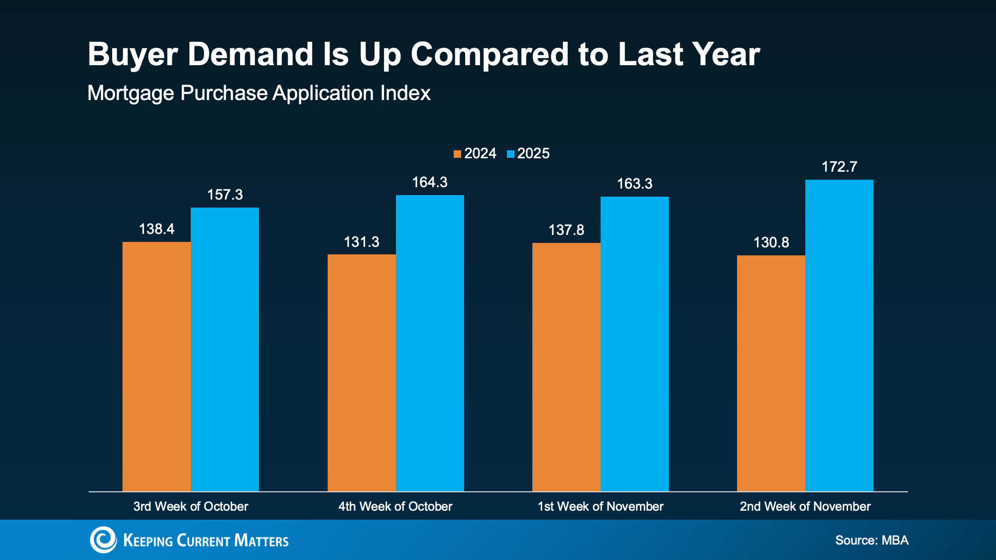 And it’s not just sellers making moves. With more options and slightly better affordability, buyers are getting back in the game, too. The Mortgage Bankers Association (MBA) reports purchase applications are up compared to last year, a clear signal that demand is building again (see graph below):